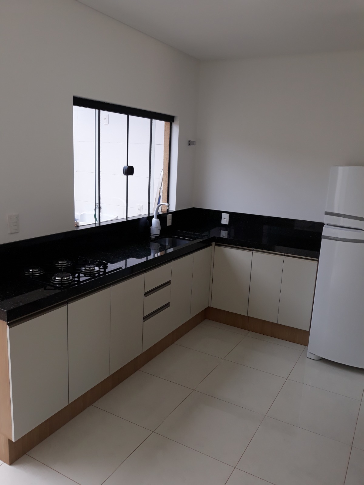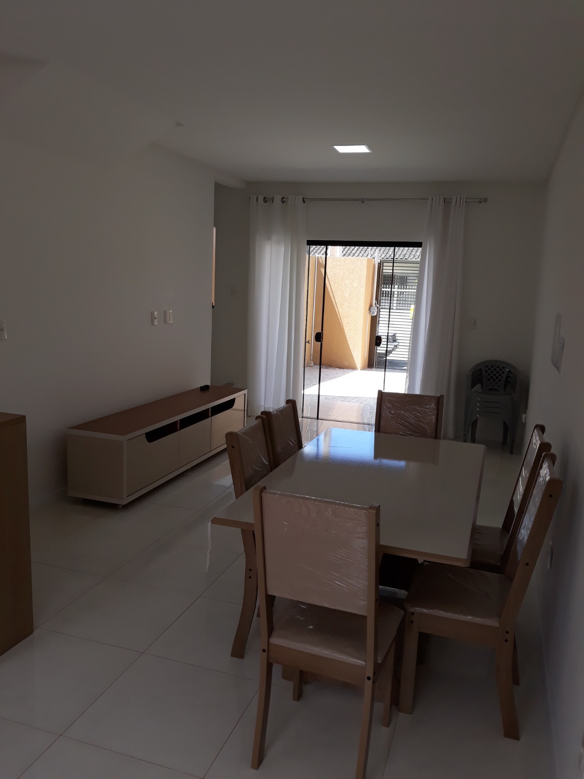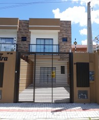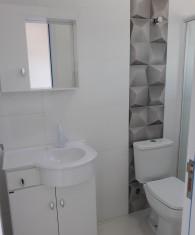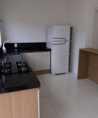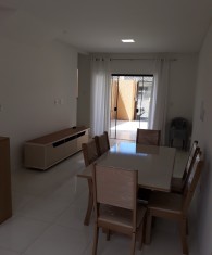 Geminado n° 01, semi mobiliado, com 2 suítes na parte superior, no andar debaixo, sala e cozinha integradas e nos fundos uma pequena área de serviço. Vaga de garagem não coberta para 01 carro;